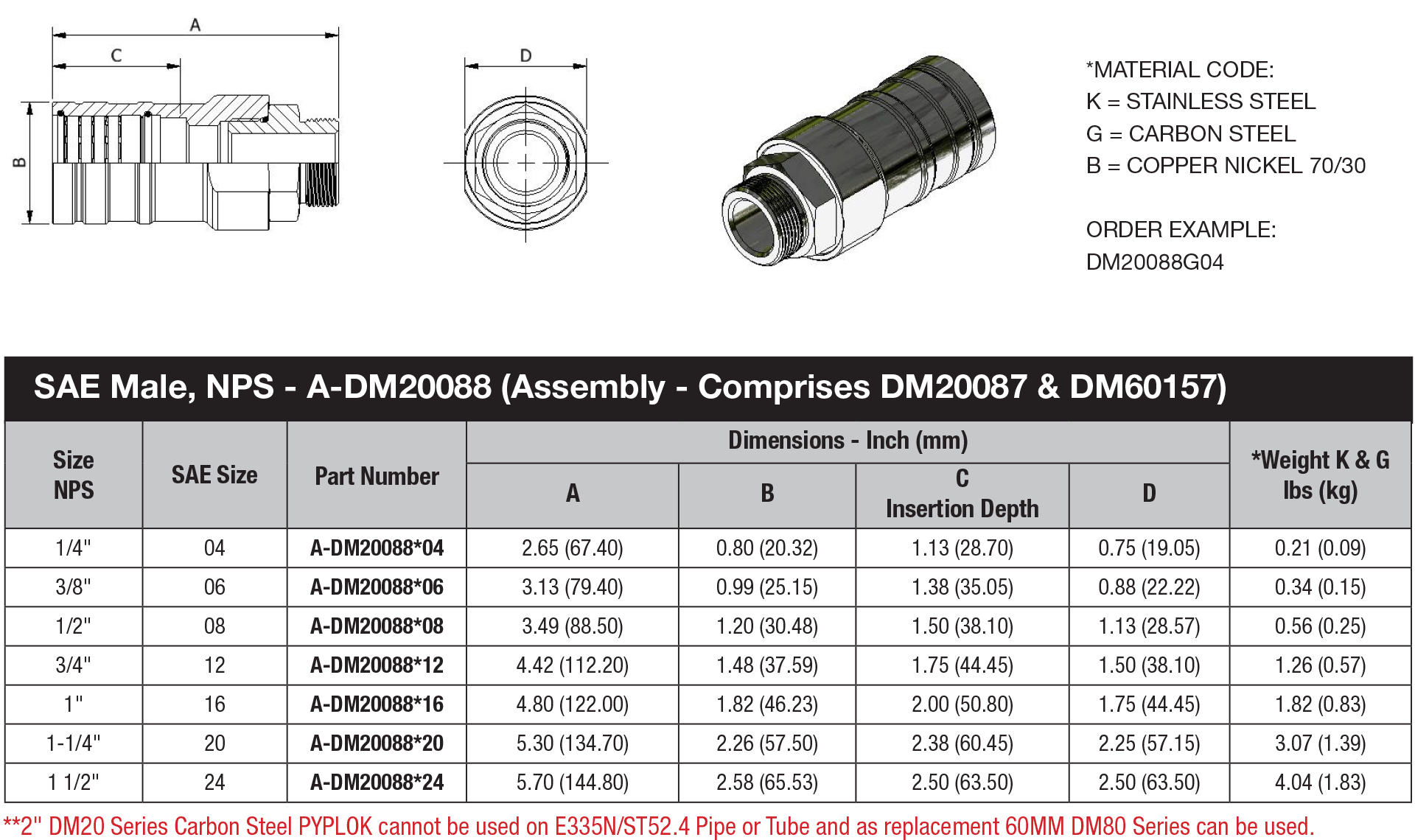 Available in sizes from ¼” to 4” NPS, Pyplok® fittings come in all standard configurations (straights, 45° & 90° elbows, adapters, tees, reducers and flanged ends). Choose from a wide range of materials including carbon steel, stainless steel, duplex, super duplex, copper nickel (CuNi), and titanium. Pyplok® fitting configurations provide permanent ends or a combination of permanent and separable ends.seal There are two seals: an inner O-ring seal, which is the primary seal, and an outer O-ring seal, the environmental seal that prevents outside contaminants from entering between the pipe and the Pyplok® fitting.
